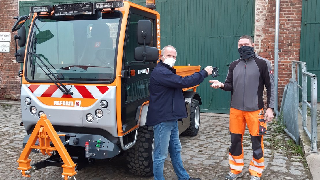 In compliance with all Corona protection measures, the responsible building yard employee, Mr. Zinnow, took delivery of the vehicle from our REFORM area sales manager, Mr. Schatt. The technical briefing and presentation of the innovations was done by our demonstrator and application technician, Mr. Czogalla.