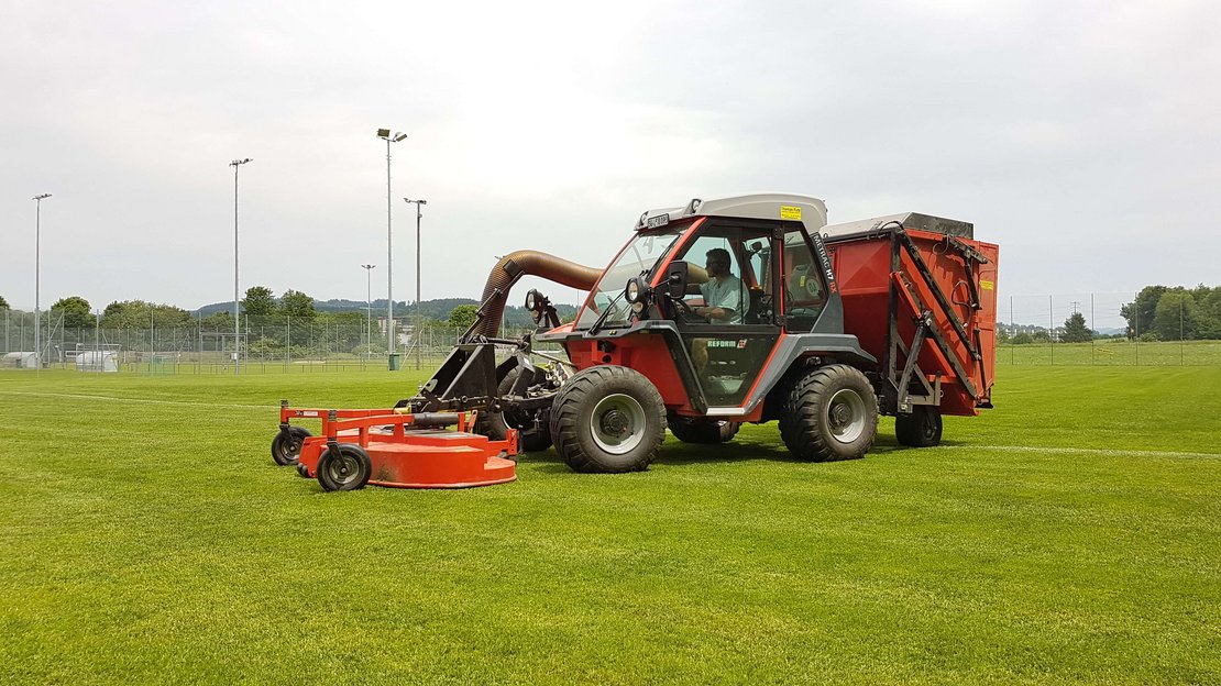 The lawns are mown twice a week. Kurt Horber, manager of the Buechenwald sports facilities, is proud of the benefits of the Metrac H7 RX reform: "I spend many hours in the vehicle. I particularly appreciate the pleasant driving comfort, the simple operation of the vehicle, the air conditioning on hot summer days and of course the great manoeuvrability thanks to all-wheel steering, which I can switch on at the push of a button. The vibration damping on the front and rear linkage is also ingenious when I'm on the road with the attachments".