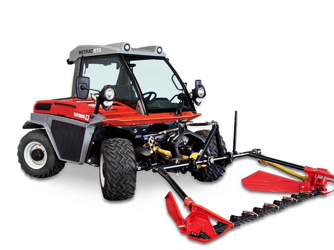 The twin-blade mowers are mounted on a 3-point linkage frame Cat. I. The integrated collision protection prevents major damage in the event of a collision with debris.