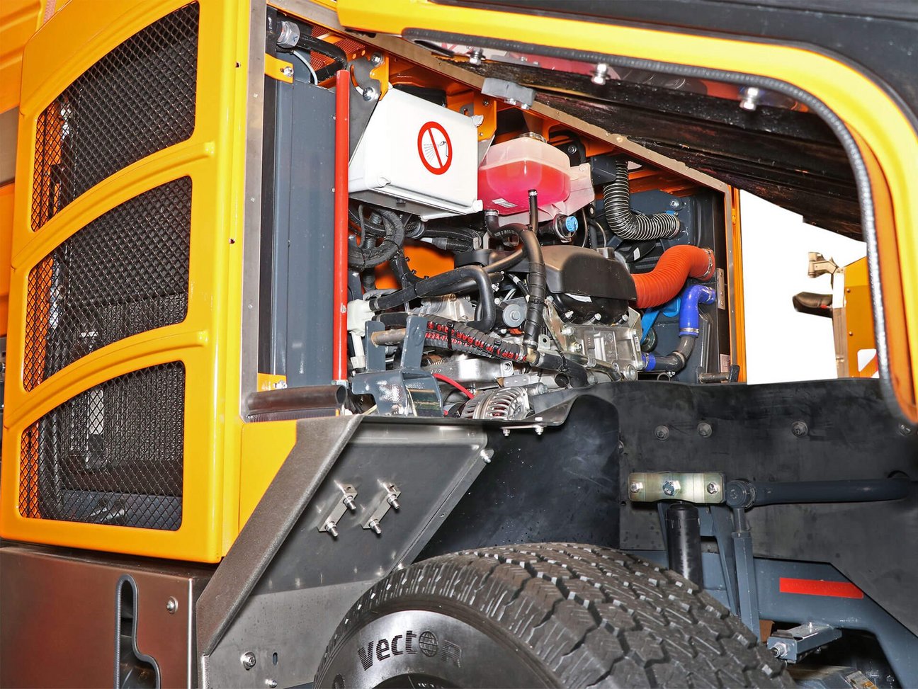 Sur tous les véhicules municipaux Boki, le moteur est positionné derrière la cabine. Les ingénieurs ont veillé à ce que tous les composants soient protégés au maximum des influences extérieures telles que les impuretés et la corrosion. La position des deux radiateurs (pour le moteur et pour l’hydraulique) est elle aussi surélevée par rapport à la zone principale d’exposition à l’encrassement, mais elle est également protégée contre les éventuels dommages dus par exemple à des bords de trottoir particulièrement hauts ou tout autre obstacle fréquemment rencontrés dans les ruelles étroites.