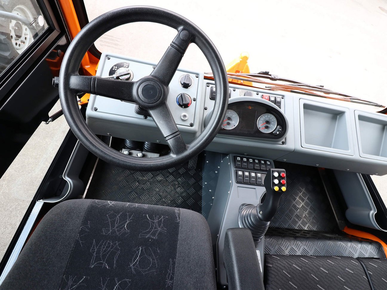Avec la faible hauteur de construction, le poste de travail est aisément accessible. Un pare-brise large et qui descend très bas offre une visibilité optimale sur l’outil porté monté à l’avant. Les portes côté conducteur comme passager sont pourvues de vitres coulissantes qui s’ouvrent largement. Les deux portes ont également une petite vitre fixe dans la partie basse qui permet de surveiller parfaitement les obstacles tels que les bordures de trottoir. À l’arrière de la cabine, le Boki est équipé d’une grande vitre qui offre une vue bien dégagée vers l’arrière.