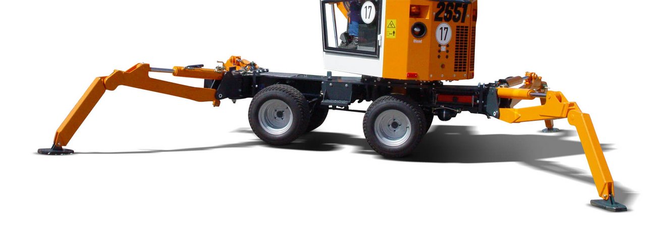 Le réglage latéral des béquilles des pelles compactes et de la 2651 se fait au moyen de roues dentées forgées, et pour les plus grandes pelles mobiles 4552 / 6552, cette fonction peut être prise en charge par le système hydraulique. Le calculateur hydraulique central commande l’appui de la pelle en pilotant chaque béquille individuellement. La rentrée et la sortie des béquilles sont commandées par voie hydraulique.