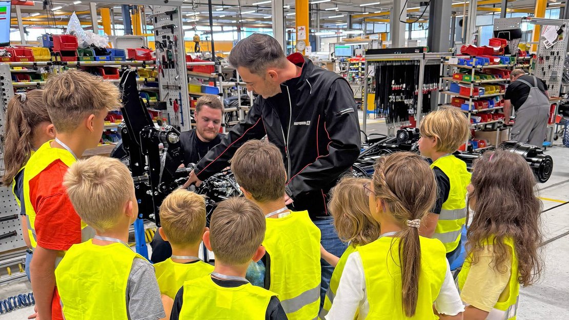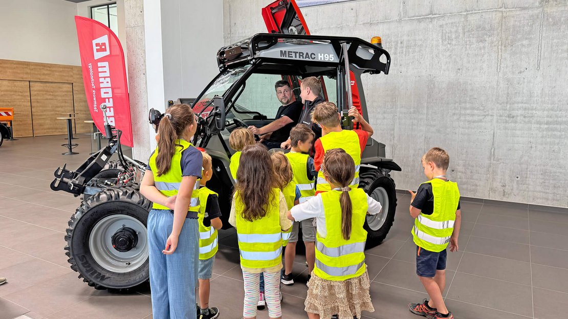 Auf spielerische Weise erfuhren sie, wie aus ersten Ideen die einzigartigen Spezialfahrzeuge wie zum Beispiel der Metrac oder Muli entstehen. Von der Entwicklung über die Konstruktion bis hin zur Teilefertigung und Montage – alles wurde kindgerecht erklärt und auch einiges konnte ausprobiert werden.