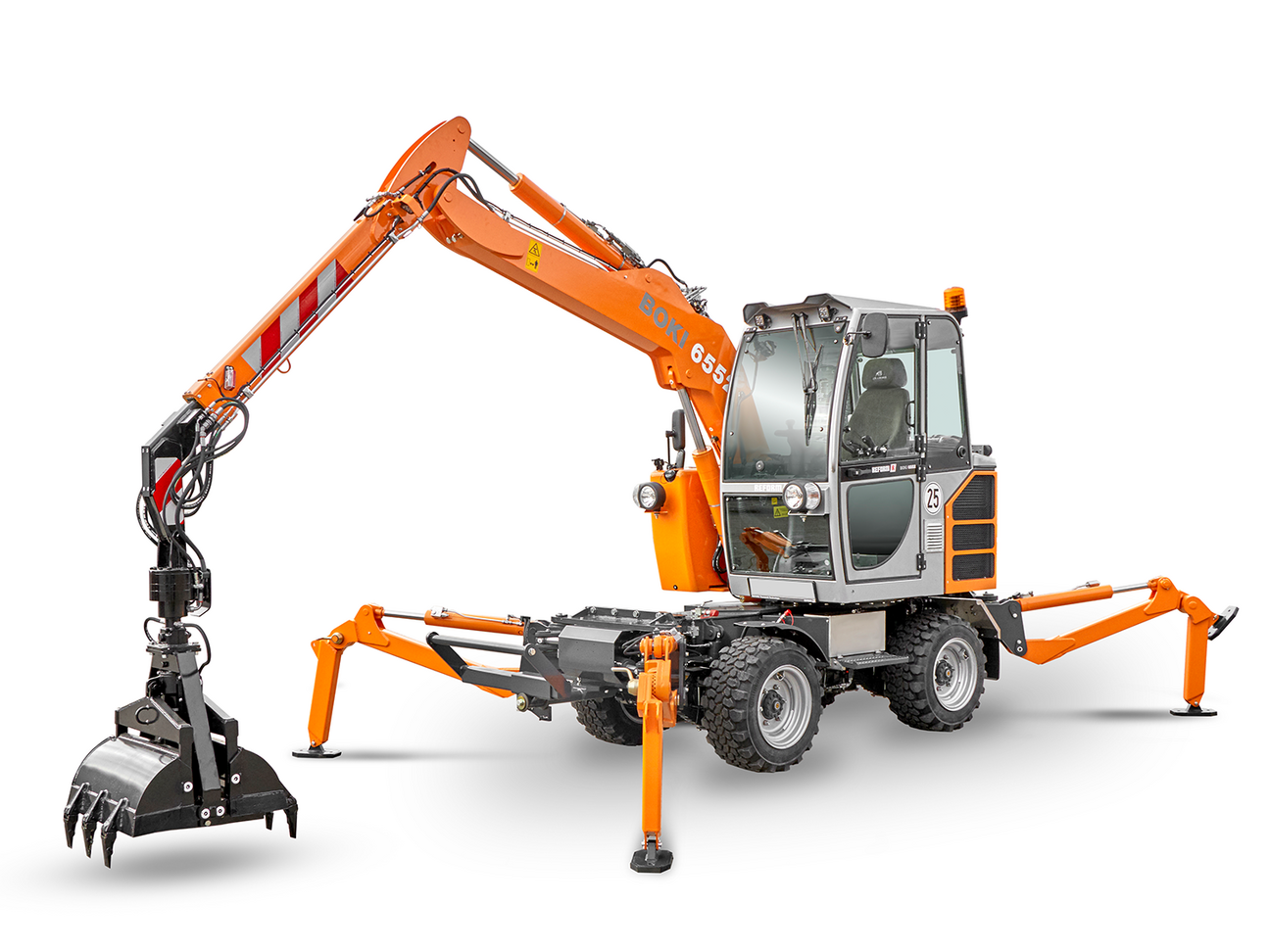 Der Boki 6552 ist der leistungsstärkste REFORM Mobilbagger. Mit seinem 4-Zylinder-VM-Dieselmotor mit 114 PS ist der Boki 6552 ein wahres Kraftpaket. Ausgestattet mit einem leistungsfähigen hydrostatischen Antrieb, der eine Höchstgeschwindigkeit von bis zu 40 km/h ermöglicht, ist ein rascher Standortwechsel möglich. Auch bei den Arbeitsleistungen setzt der Boki 6552 Maßstäbe, so kann er mit Teleskopausleger mit einer Reichweite von 6.500 mm oder sogar 7.000 mm erreichen. In der Standardausführung sind 5.400 mm möglich. Ausgestattet mit einer leistungssfähigen Loadsensing Hydraulikanlage erreicht der Boki 6552 eine sehr hohe Grableistung.
