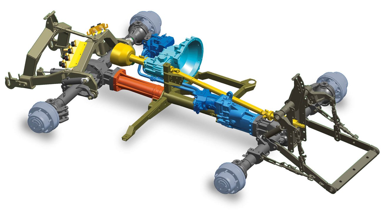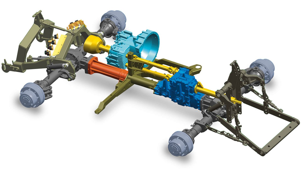 Der hydrostatische Antrieb erfolgt vom Dieselmotor auf die Verstellpumpe, die mit dem Verstellmotor einen hydraulischen Kreislauf bildet, und ab dann mechanisch, über das nachgeschaltete 2-stufige Gruppengetriebe, auf die Räder.