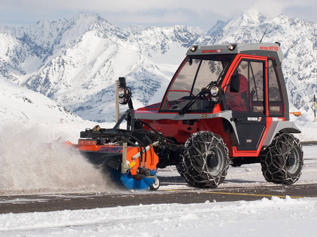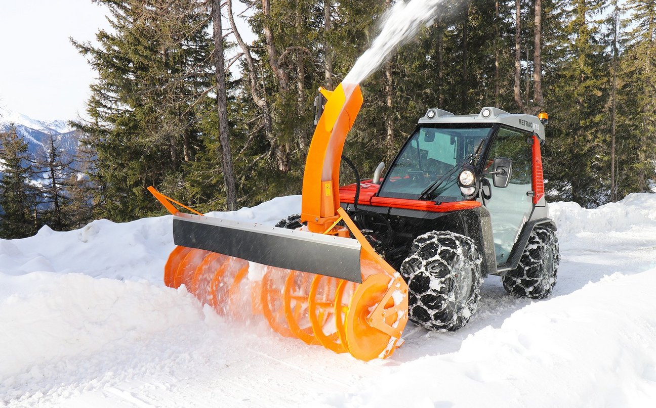 Große Schneemassen werden oft durch Schneefräsen beseitigt. Der Antrieb erfolgt mechanisch, was eine hohe Fräsleistung garantiert. Die großdimensionierten Frästrommeln und die aggressiven Schleuderräder verleihen den Schneefräsen eine sehr hohe Wurfleistung. Eine Arbeitsbreite von 2 bis 2,2 m sorgt für effiziente Schneeräumung auch bei großen Schneemassen. Die Verstellung des Kamins, der Klappen und der Querneigung übernimmt der Fahrer mittels des ergonomischen Joysticks.