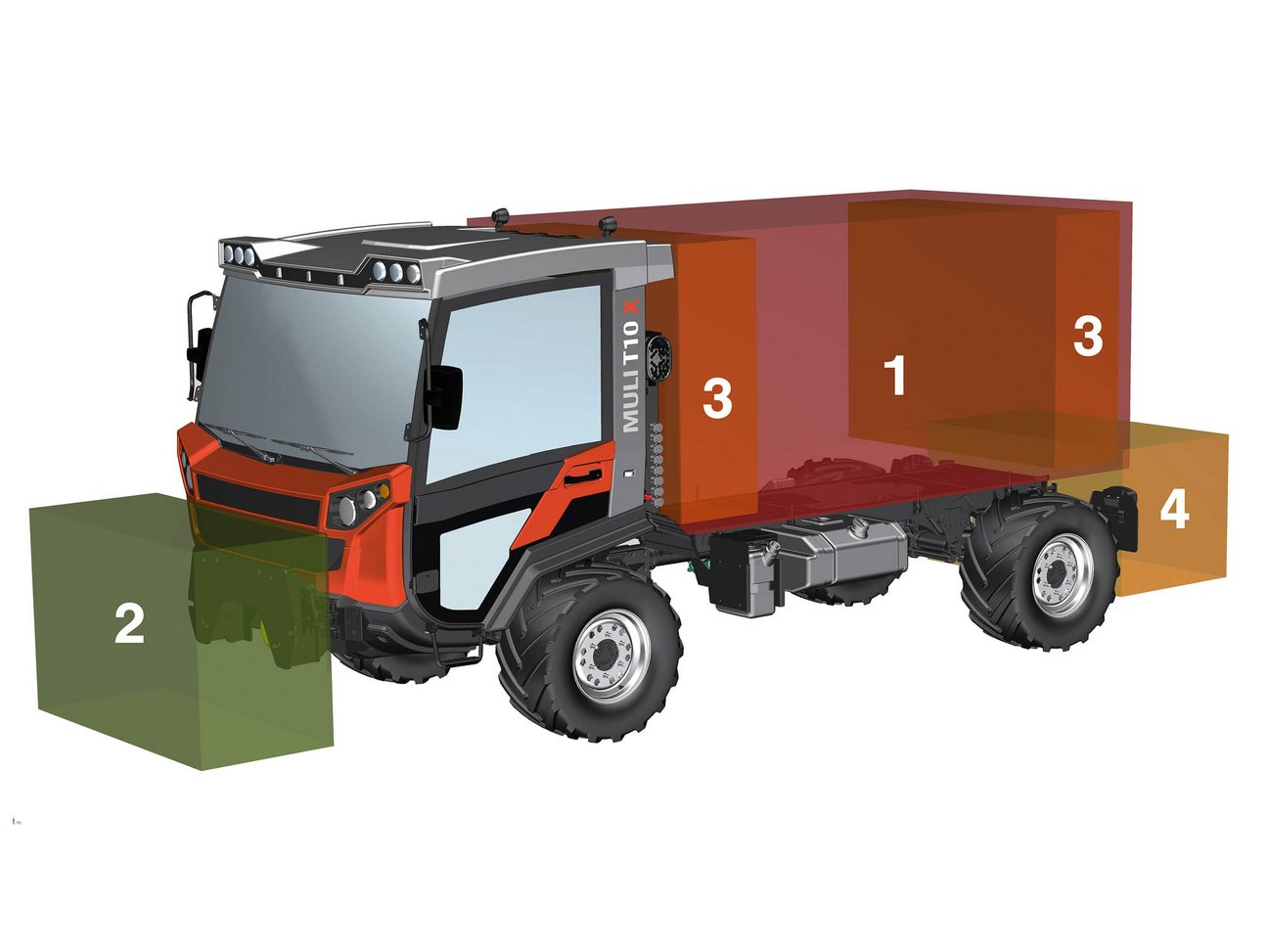 Das Muli-Fahrgestell ist für die Aufnahme von Wechselaufbauten konzipiert. Schnell auf- und absattelbare Aufbauten wie Kipper, Ladewagen, Winterdienstgeräte, Laubsauger, Kran, Absetzmulde und viele weitere ergeben eine kompakte, vielseitig einsetzbare Arbeitsmaschine. Alle Muli bieten 4 vollwertige Anbauräume für eine Vielzahl von An- und Aufbaugeräten. Neben dem Hauptrahmen gibt es noch den Frontanbauraum wo z.B. Schneepflug, Schneefräse, Laubsauger oder Scheibenmähwerk angebaut werden. Ein Aufbaurahmen dient als Befestigungspunt für Ladekräne, wobei diese entweder direkt hinter der Kabine oder am Heck angebaut werden können. Zu guter Letzt gibt es beim Muli auch noch den Heckanbauraum, wo unterschiedliche 3 Punkt Anbaugeräte oder auch ein Anhänger angekuppelt werden können.