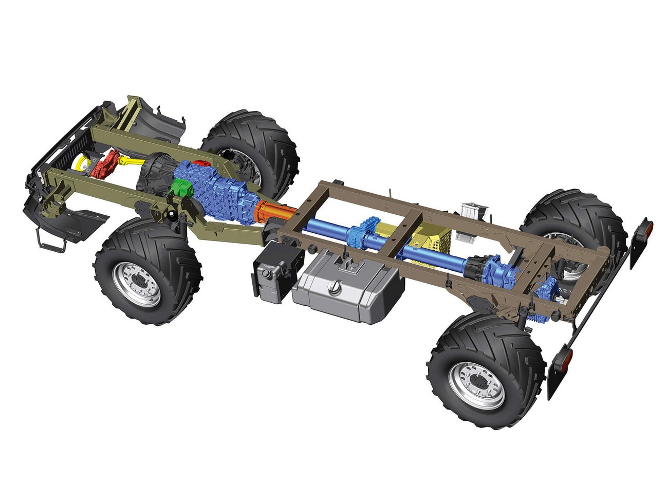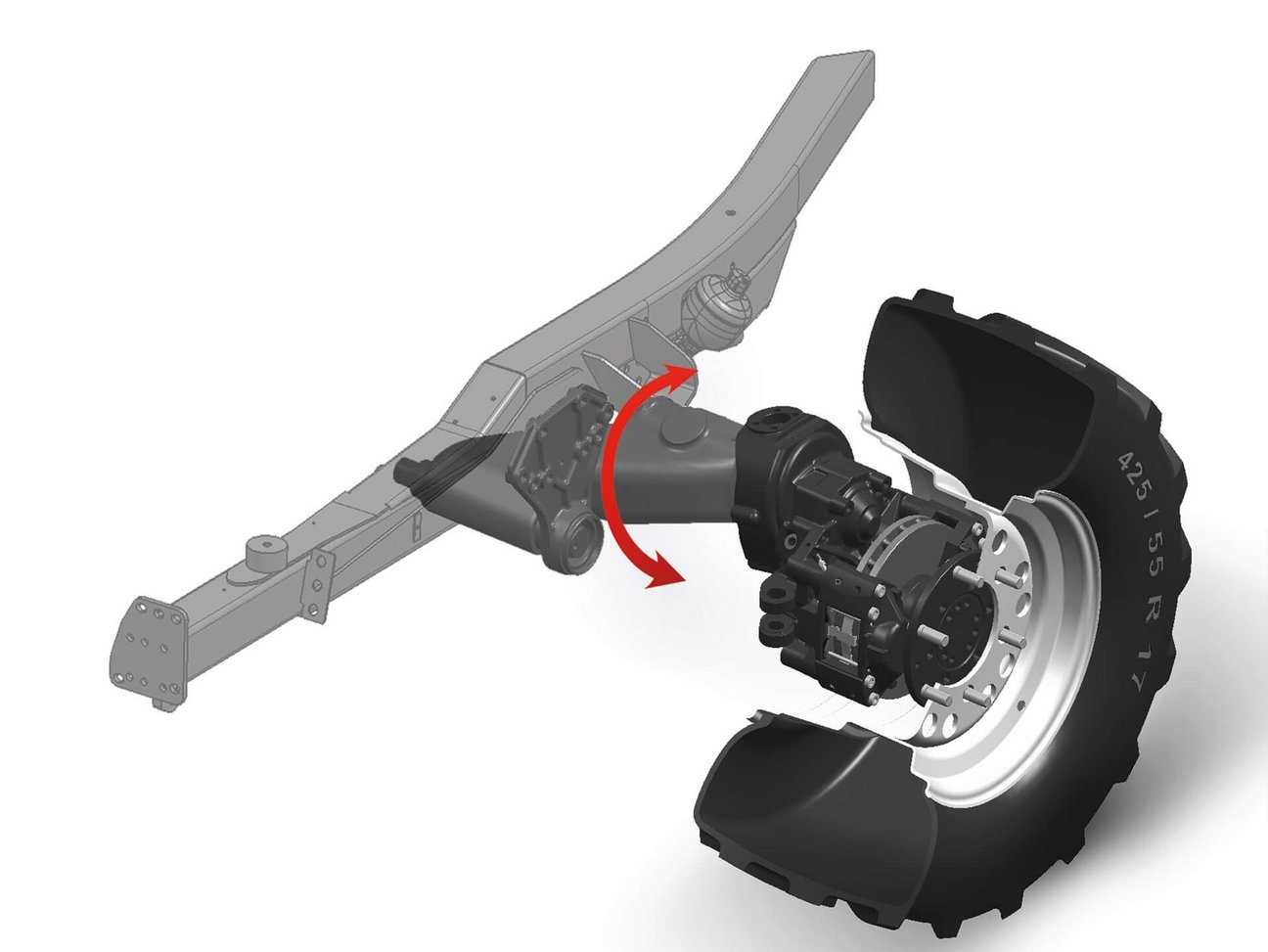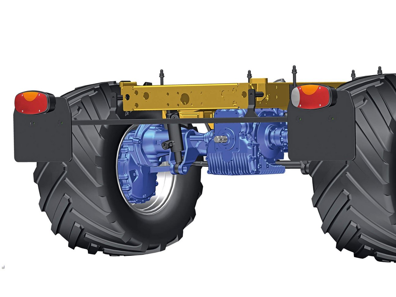 Robuste Lenktriebachsen mit Portalachsen sorgen für hohe Zugleistung und schonen den Antriebsstrang. Es wirken geringere Kräfte auf die Antriebswellen und ermöglichen dadurch eine leichtere Bauweise. Dies spart Gewicht und wirkt sich positiv auf die Bodenschonung aus. Zudem ermöglichen Portalachsen eine enorme Bodenfreiheit von bis zu 400 mm.