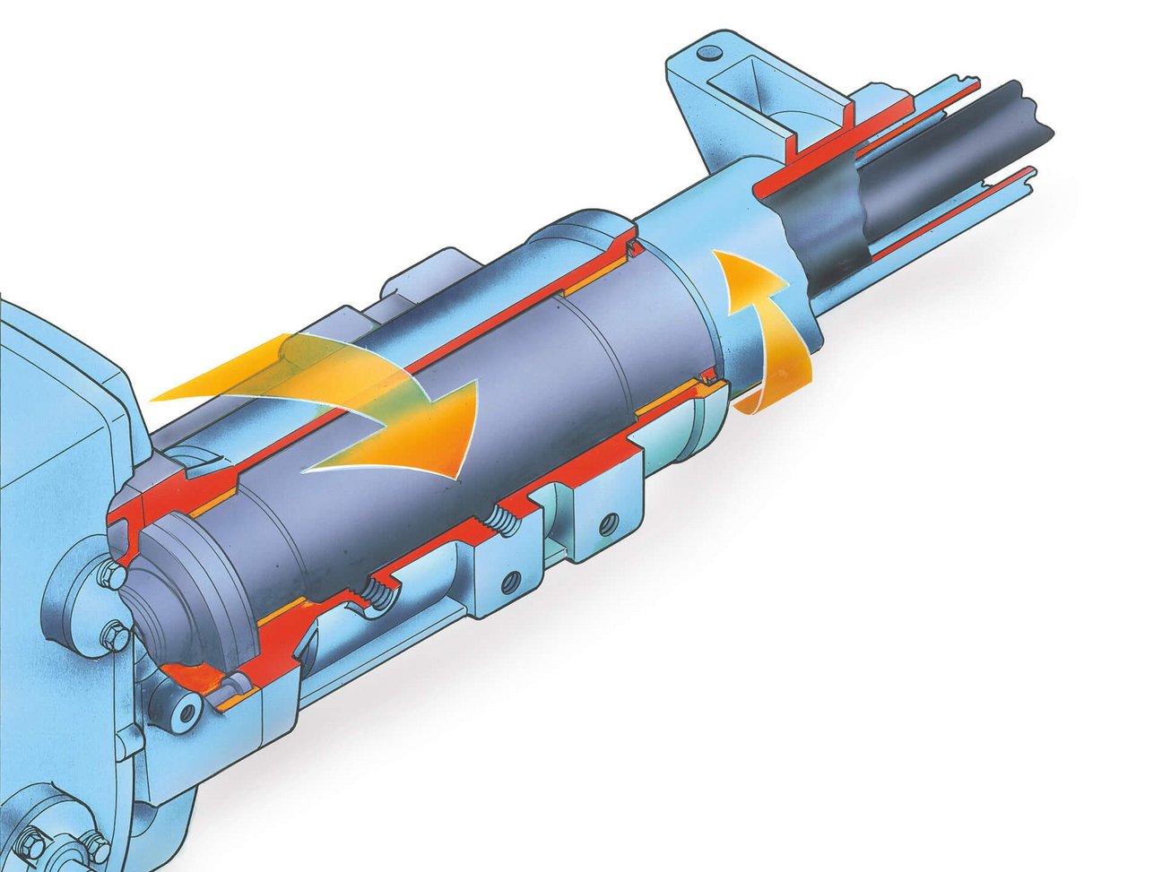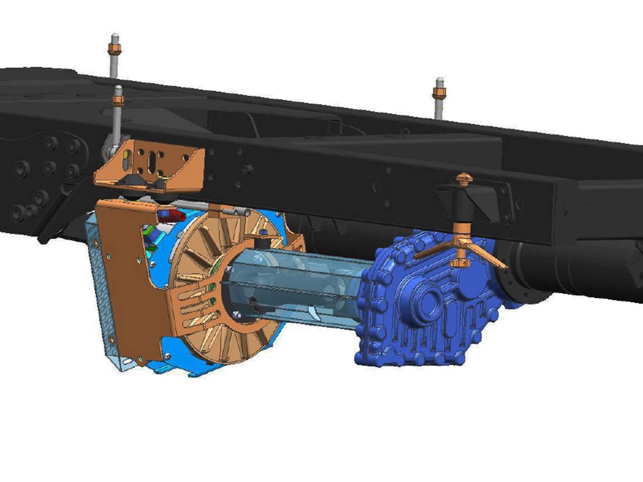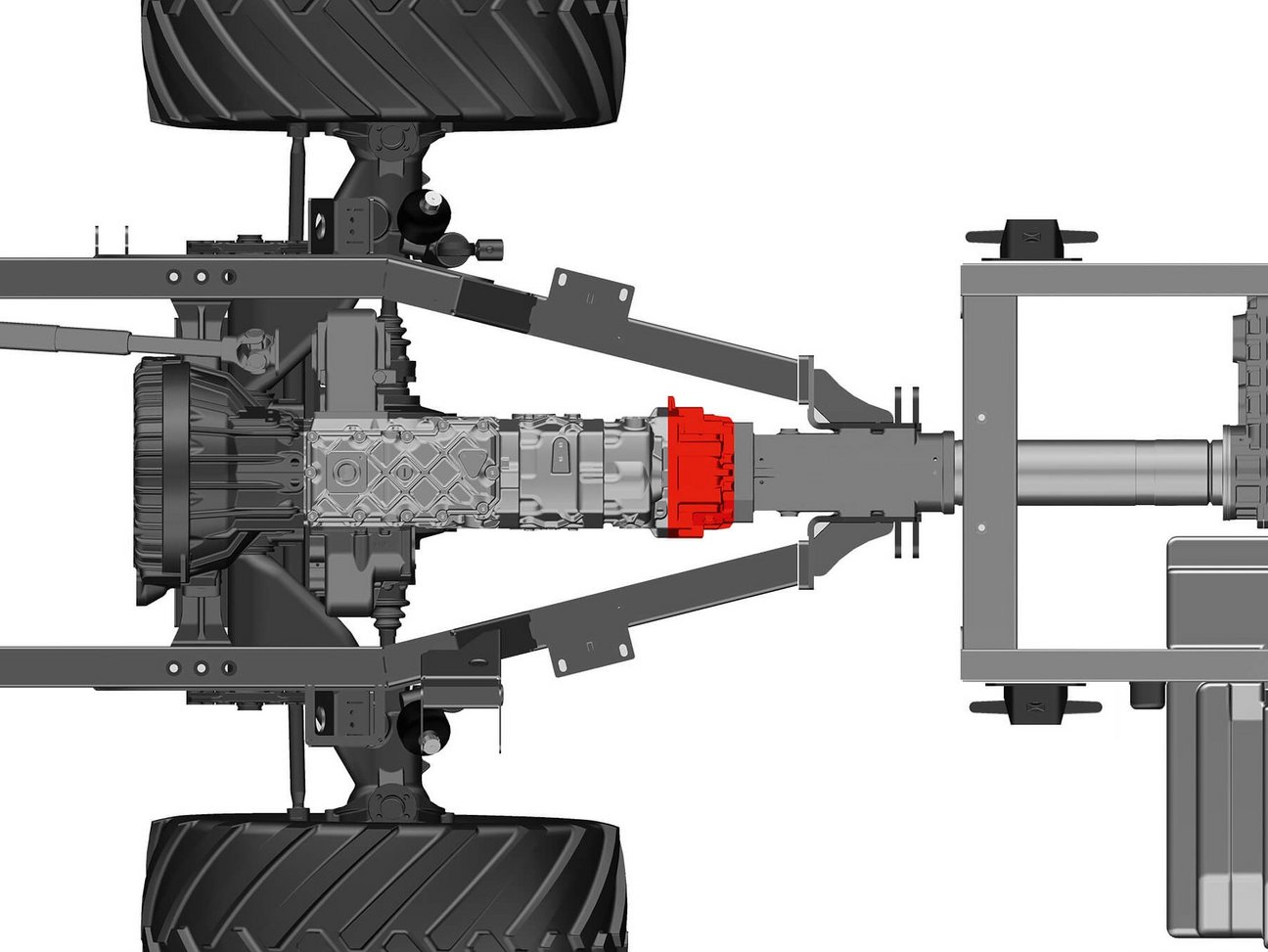 Ein Zentralrohr mit integriertem Fahr- und Zapfwellenantrieb verbindet die Vorderachse inkl. Getriebe mit der Hinterachse. Der Achsantrieb und vor allem auch der Zapfwellenantrieb werden direkt und optimal geschützt durch das Zentralrohr nach hinten geführt. Dadurch gibt es keine Wickel- und Verschmutzungsgefahr. Die Verdrehung des Aufbau- und Hauptrahmens erfolgt verspannungsfrei im Zentrum des Drehgelenkes. Dadurch sind weder Verdrehdämpfung noch Verdrehanschlag notwendig.