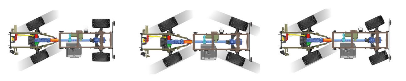 - Vorder- und Hinterräder werden gleich weit eingeschlagen und laufen exakt in derselben Spur